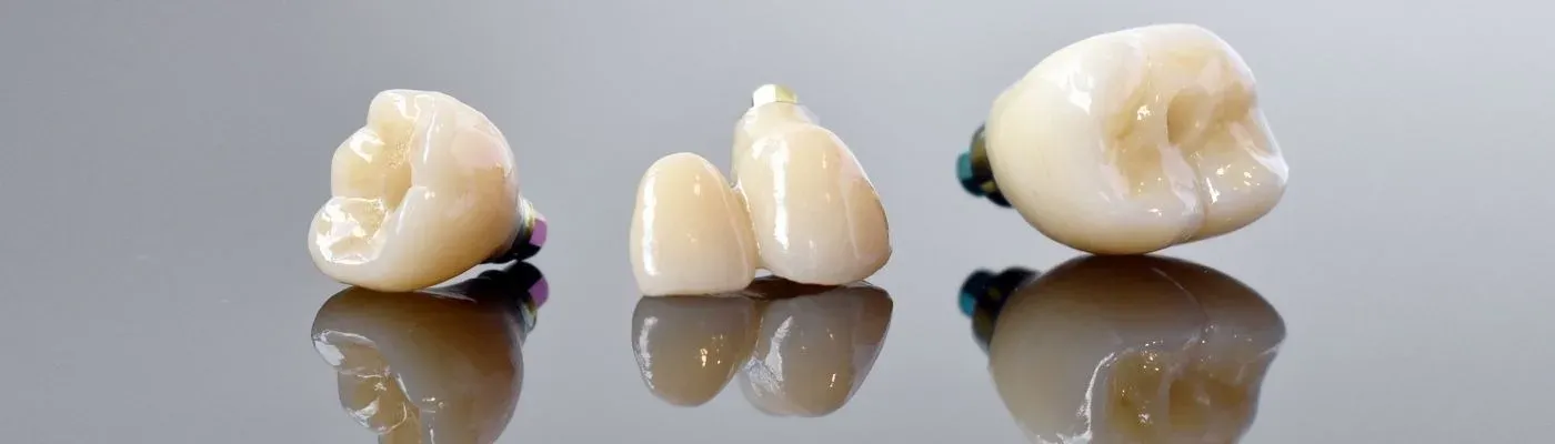 Dental implants have three key components: a titanium post (implant), a connecting abutment, and a crown or bridge. Both the implant and abutment are made from high-grade, biocompatible titanium. Crowns are typically crafted from zirconia, porcelain-layered zirconia, or gold, while fixed bridges (replacing two or more teeth) are usually made of durable zirconia.